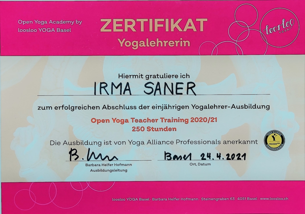- Teachertraining 250 Std. bei der Akademie Loosloo in Basel, Zertifikat von Yoga